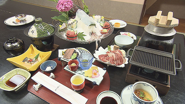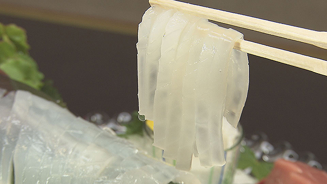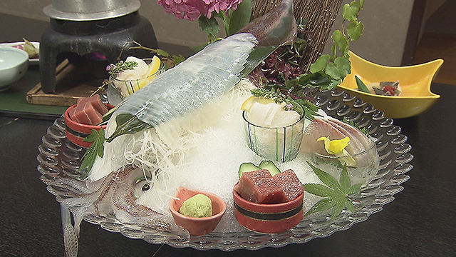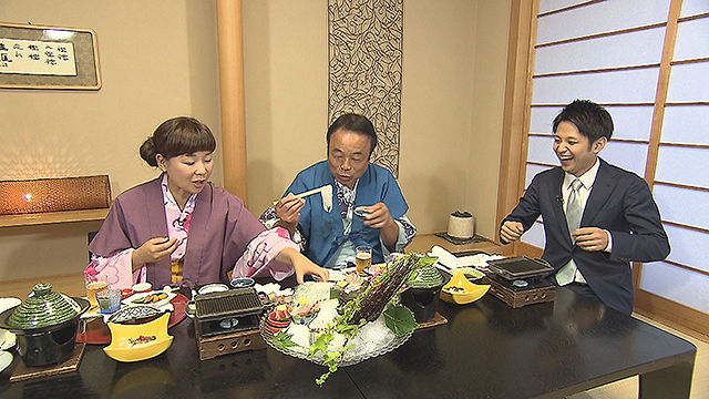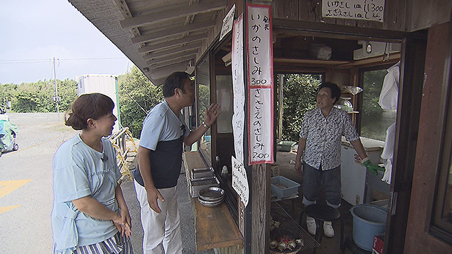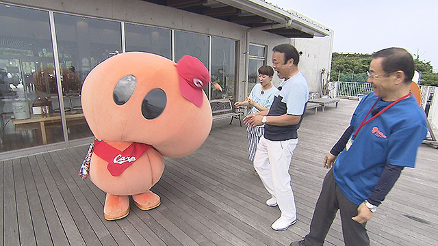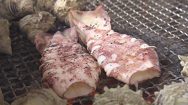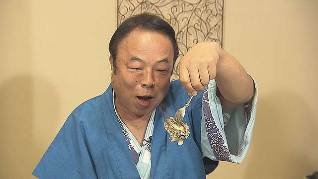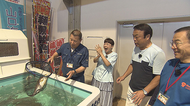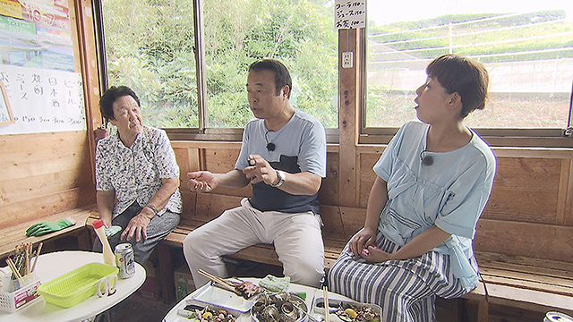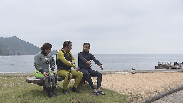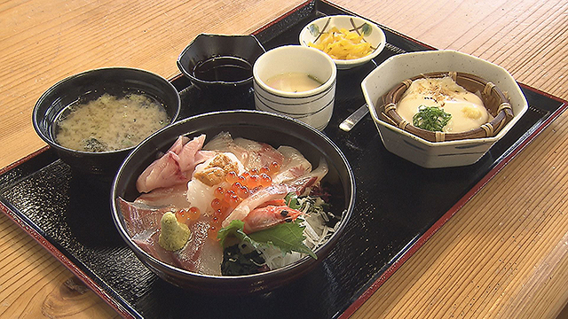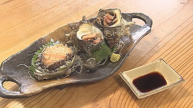 人気の秘密は、絶景、ゆるキャラ、そして古墳!?大きな生簀にはその朝獲れた鮮魚が泳ぎ、新鮮で豪快な海鮮丼をいただくことができるんです。さらに、角島で有名な美人海女の店へ。自ら海へ入り収穫したサザエを焼いておもてなし。