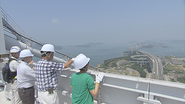 1泊2日のツアーが完成しました。まずは、瀬戸大橋でスペシャル体験を!それはなんと、瀬戸大橋の塔頂。海面から175m地点で眺める瀬戸内海のパノラマ風景に大感動。