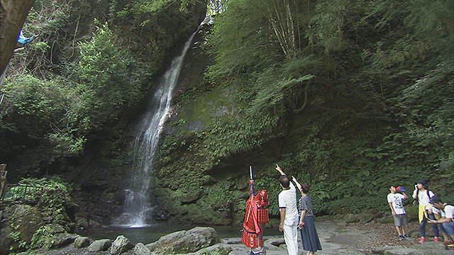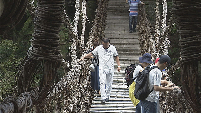 徳島県大歩危・祖谷観光では、平家の武将に扮したガイドさんが、かずら橋を楽しく案内します。