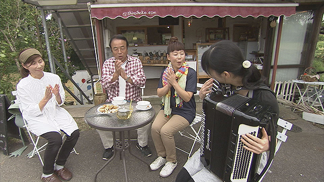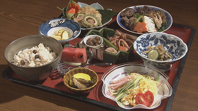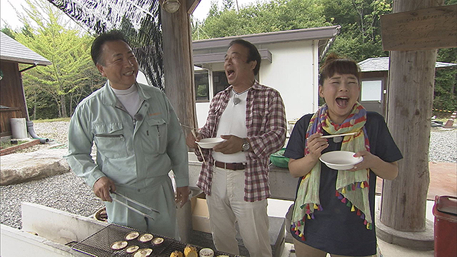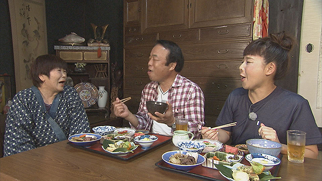熟女が営む民宿では、ムカゴご飯や旬の野菜料理に舌鼓。
