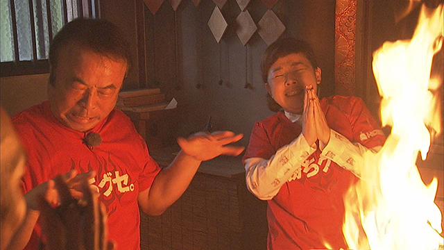 ナベさん&松本は燃え盛る炎に向かってカープ日本一を祈願!