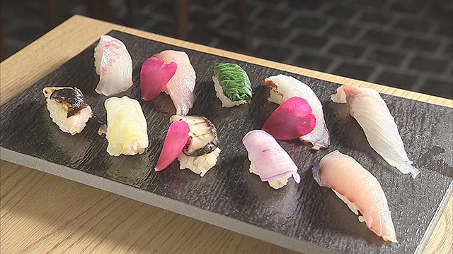 今回は、男性チームvs女性チームに分かれてそれぞれオススメのお寿司屋さんをめぐります。伊藤アナ&松本は、女子会に最適なオシャレ寿司。漁師から直接買い付ける鮮魚と無農薬野菜がウリの彩り豊かな一皿。シャリに入るのは、ヘルシーなアレ!?