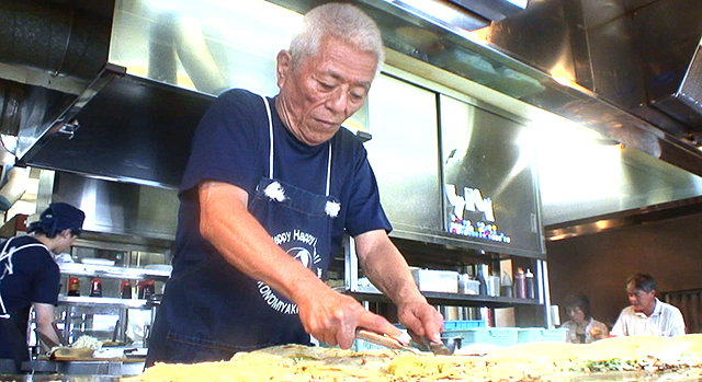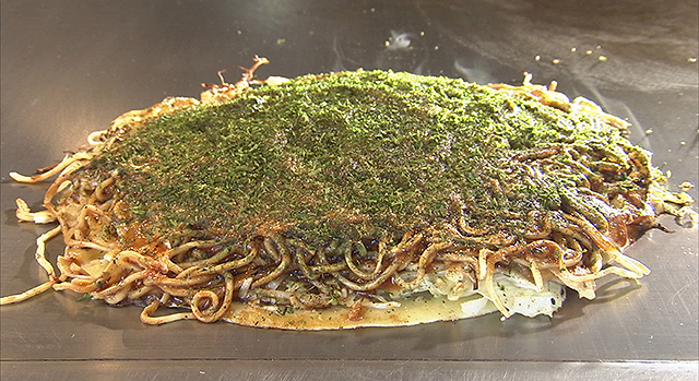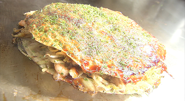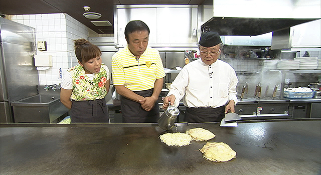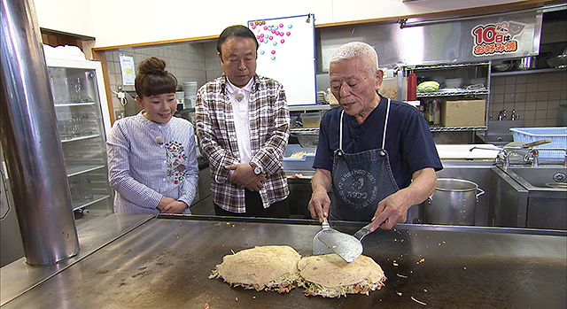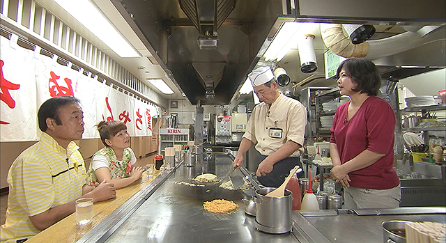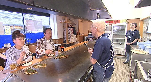 続いて2人は、誰もが知る人気店「八昌」へ。鉄板の厚さから火加減、食材の選び方など随所にこだわる大将。実は数年前に癌を患い闘病し、その後見事復活。現在も中区幟町の店でヘラを握り続けています。病を乗り越えることができたその理由には、お好み焼きへの熱き想いと、家族への愛がありました。