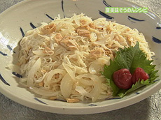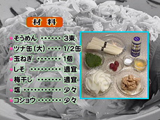 ②①に固めにゆでたそうめんを加えて炒め、器に盛って大葉と梅干しを添える。