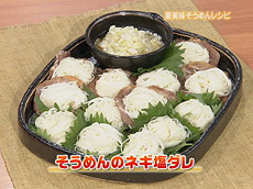 ③お皿に①の豚肉や大葉を広げ、その上に、そうめんを乗せ、 ②のネギ塩ダレを乗せて出来上がり!