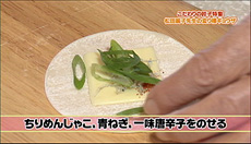 作り方 ①餃子の皮を広げチーズをのせ、上にちりめんじゃこ、一味唐辛子、青ねぎをのせる。
