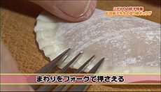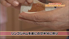 ②餃子の皮にりんごジャムをのせ半分に折り、周りをフォークで押さえる。