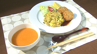⑤ ②③④と塩・コショウを混ぜ合わせ、豆乳で固さを調節し4個に分け形を整える。