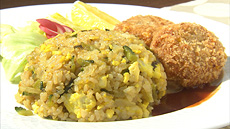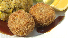 ⑥ ⑤に地粉を付け、水で溶いた地粉を付け、パン粉を付けて180℃の油でカラリと揚げる。