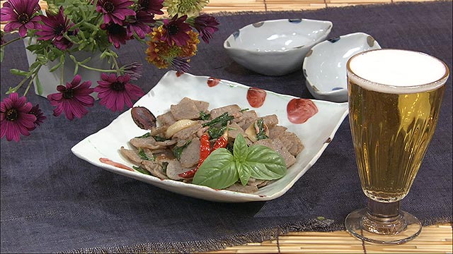「ひらひらコンニャクの塩辛炒め」